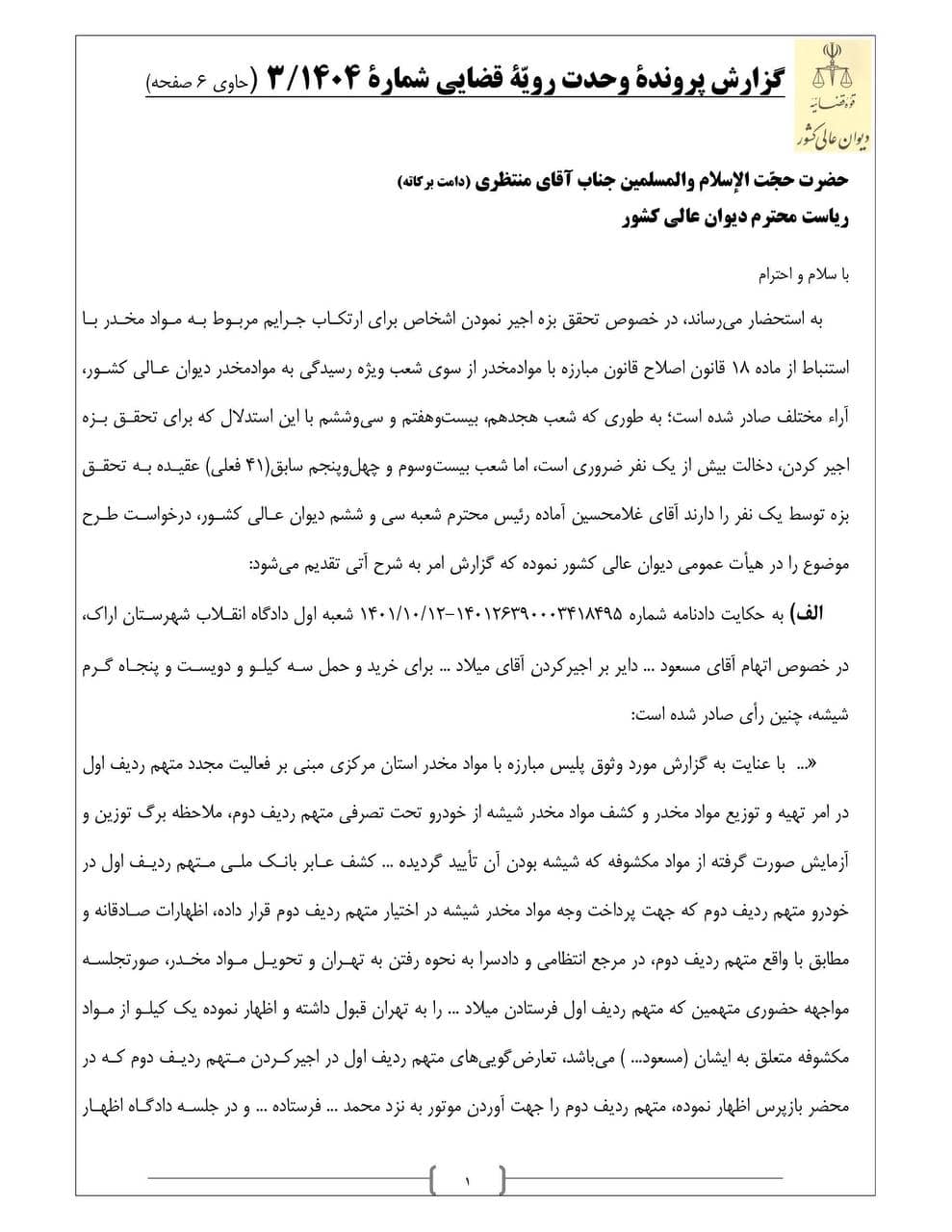 (الف) به حکایت دادنامه شماره ۱۴۰۱۲۶۳۹۰۰۰۳۴۱۸۴۹۵-۱۴۰۱/۱۰/۱۲ شعبه اول دادگاه انقلاب شهرستان اراک در خصوص اتهام آقای مسعود …. دایر بر اجیر کردن آقای میلاد … برای خرید و حمل سه کیلو و دویست و پنجاه گرم شیشه چنین رأی صادر شده است