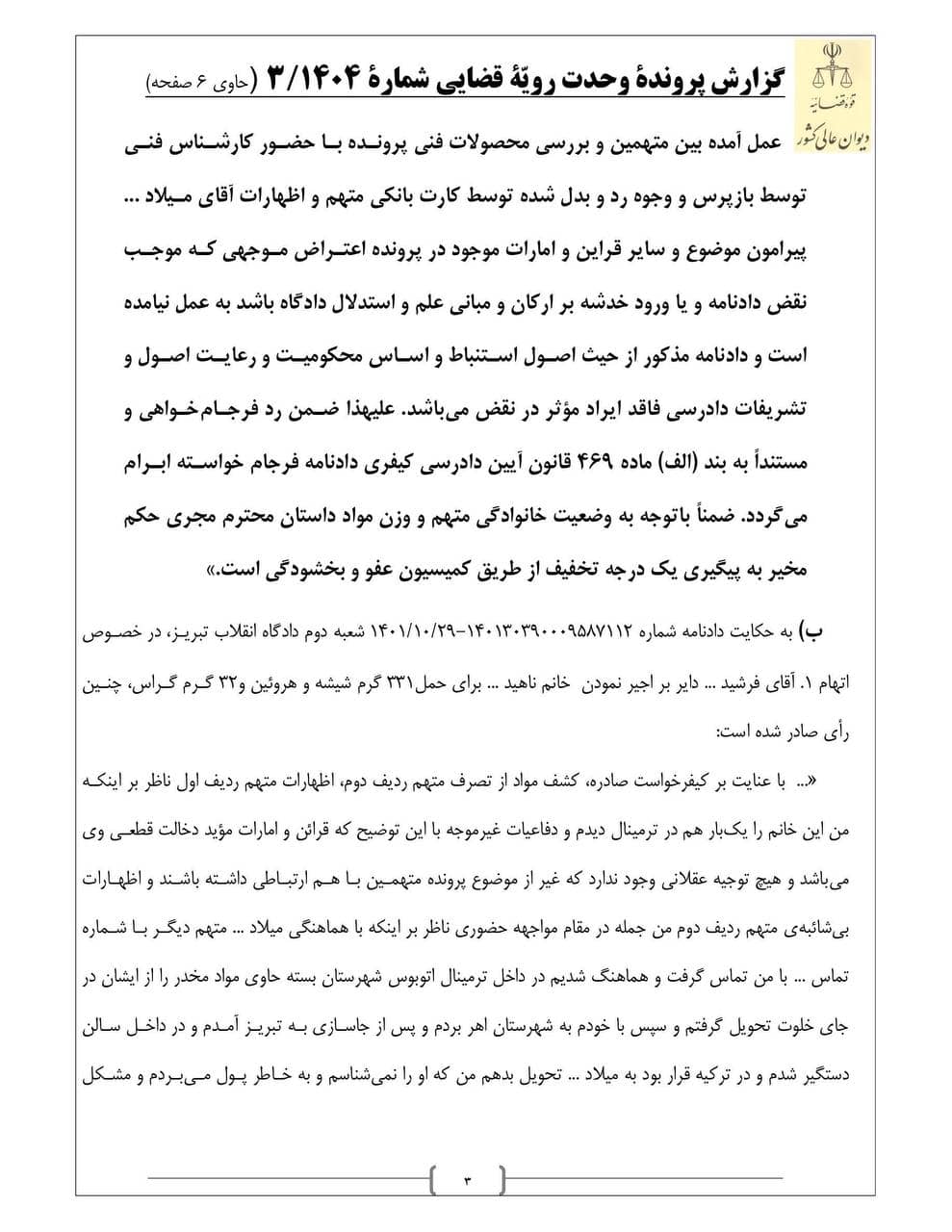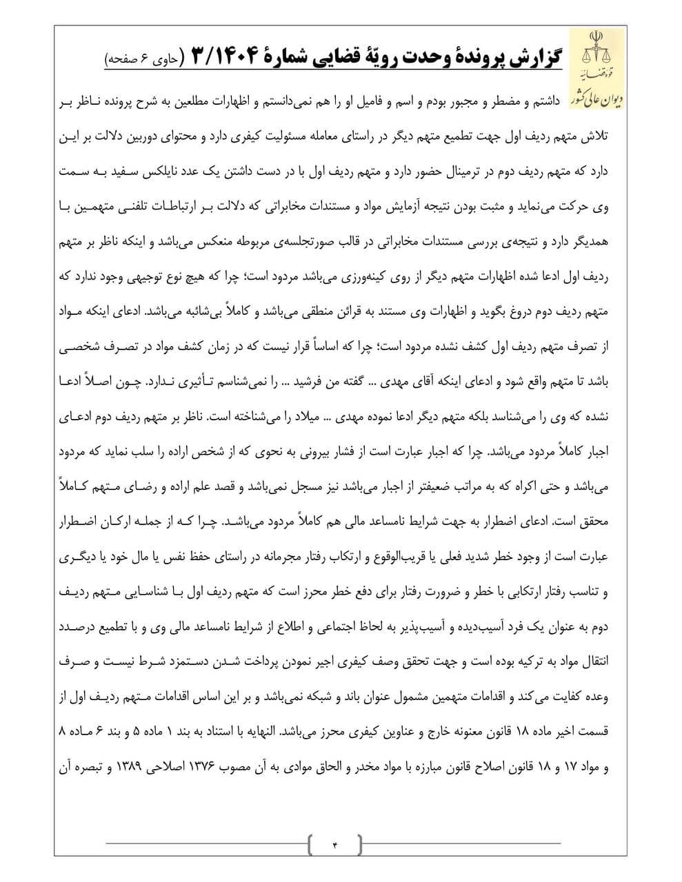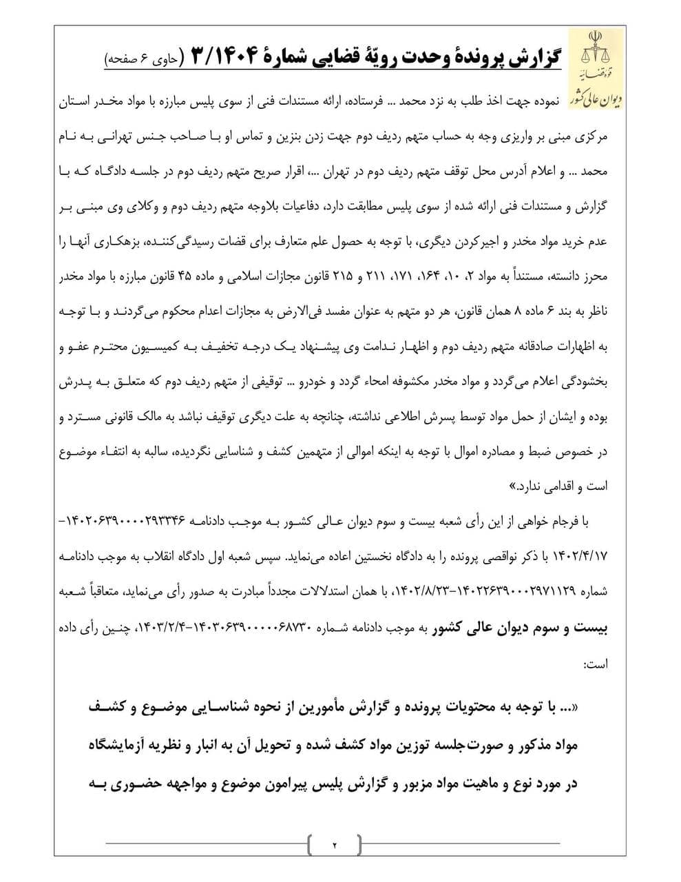 «…. با توجه به محتویات پرونده و گزارش مأمورین از نحوه شناسایی موضوع و کشف مواد مذکور و صورت جلسه توزین مواد کشف شده و تحویل آن به انبار و نظریه آزمایشگاه در مورد نوع و ماهیت مواد مزبور و گزارش پلیس پیرامون موضوع و مواجهه حضوری به عمل آمده بین متهمین و بررسی محصولات فنی پرونده با حضور کارشناس فنی توسط بازپرس و وجوه رد و بدل شده توسط کارت بانکی متهم و اظهارات آقای میلاد …. پیرامون موضوع و سایر قراین و امارات موجود در پرونده اعتراض موجهی که موجب نقض دادنامه و یا ورود خدشه بر ارکان و مبانی علم و استدلال دادگاه باشد به عمل نیامده است و دادنامه مذکور از حیث اصول استنباط و اساس محکومیت و رعایت اصول و تشریفات دادرسی فاقد ایراد مؤثر در نقض میباشد. علیهذا ضمن رد فرجام خواهی و مستنداً به بند (الف) ماده ۴۶۹ قانون آیین دادرسی کیفری دادنامه فرجام خواسته ابرام می گردد. ضمناً با توجه به وضعیت خانوادگی متهم و وزن مواد داستان محترم مجری حکم مخیر به پیگیری یک درجه تخفیف از طریق کمیسیون عفو و بخشودگی است.»