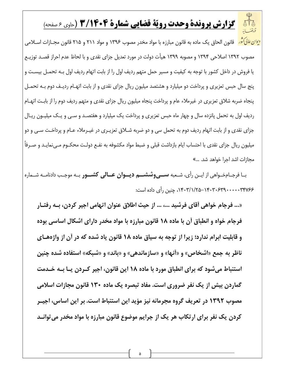 با فرجام خواهی از این رأی شعبه بیست و سوم دیوان عالی کشور به موجب دادنامه ۱۴۰۲۰۶۳۹۰۰۰۰۲۹۳۳۴۶ ۱۴۰۲/۴/۱۷ با ذکر نواقصی پرونده را به دادگاه نخستین اعاده مینماید سپس شعبه اول دادگاه انقلاب به موجب دادنامه شماره ۱۴۰۲۲۶۳۹۰۰۰۲۹۷۱۱۲۹- ۱۴۰۲/۸/۲۳، با همان استدلالات مجدداً مبادرت به صدور رأی می نماید.