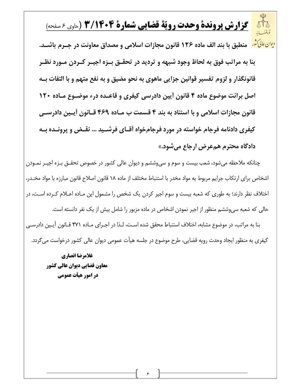 «….. فرجام خواهی آقای فرشید …. … از حیث اطلاق عنوان اتهامی اجیر کردن به رفتار فرجام خواه و انطباق آن با ماده ۱۸ قانون مبارزه با مواد مخدر دارای اشکال اساسی بوده و قابلیت ابرام ندارد؛ زیرا از توجه به سیاق ماده ۱۸ قانون یاد شده که در آن از واژه های ناظر به جمع اشخاص» و «آنها» و «سازماندهی» و «باند» و «شبکه» استفاده شده چنین استنباط میشود که برای انطباق مورد با ماده ۱۸ این قانون اجیر کردن یا به خدمت گماردن بیش از یک نفر ضروری است مفاد تبصره یک ماده ۱۳۰ قانون مجازات اسلامی مصوب ۱۳۹۲ در تعریف گروه مجرمانه نیز مؤید این استنباط است. بر این اساس اجیر کردن یک نفر برای ارتکاب هر یک از جرایم موضوع قانون مبارزه با مواد مخدر می تواند منطبق با بند الف ماده ۱۲۶ قانون مجازات اسلامی و مصداق معاونت در جرم باشد. بنا به مراتب فوق به لحاظ وجود شبهه و تردید در تحقق بزه اجیر کردن مورد نظر قانونگذار و لزوم تفسیر قوانین جزایی ماهوی به نحو مضیق و به نفع متهم و با التفات به اصل برائت موضوع ماده ۴ قانون آیین دادرسی کیفری و قاعده در موضوع ماده ۱۲۰ قانون مجازات اسلامی و با استناد به بند ۴ قسمت ب ماده ۴۶۹ قانون آیین دادرسی کیفری دادنامه فرجام خواسته در مورد فرجام خواه آقای فرشید … نقض و پرونده به دادگاه محترم هم عرض ارجاع میشود.»