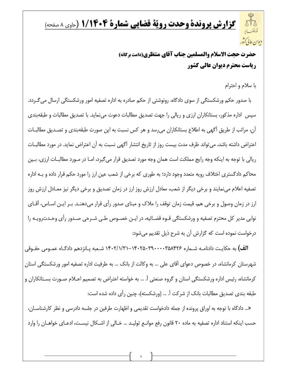 الف) به حکایت دادنامه شماره ۱۴۰۲۵۰۳۹۰۰۰۰۳۵۸۴۲۶- ۱۴۰۲/۱/۳۱ شعبه پانزدهم دادگاه عمومی حقوقی شهرستان کرمانشاه در خصوص دعوای آقای علی …. به وکالت از بانک …. به طرفیت اداره تصفیه امور ورشکستگی استان کرمانشاه رئیس اداره ورشکستگی استان و گروه صنعتی ….. به خواسته اعتراض به تصمیم اعلام صورت بستانکاران و طبقه بندی تصدیق مطالبات بانک از شرکت …. ورشکسته چنین رأی داده شده است.