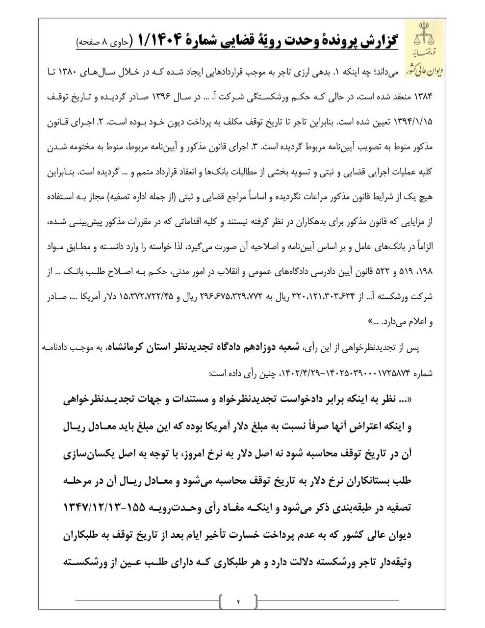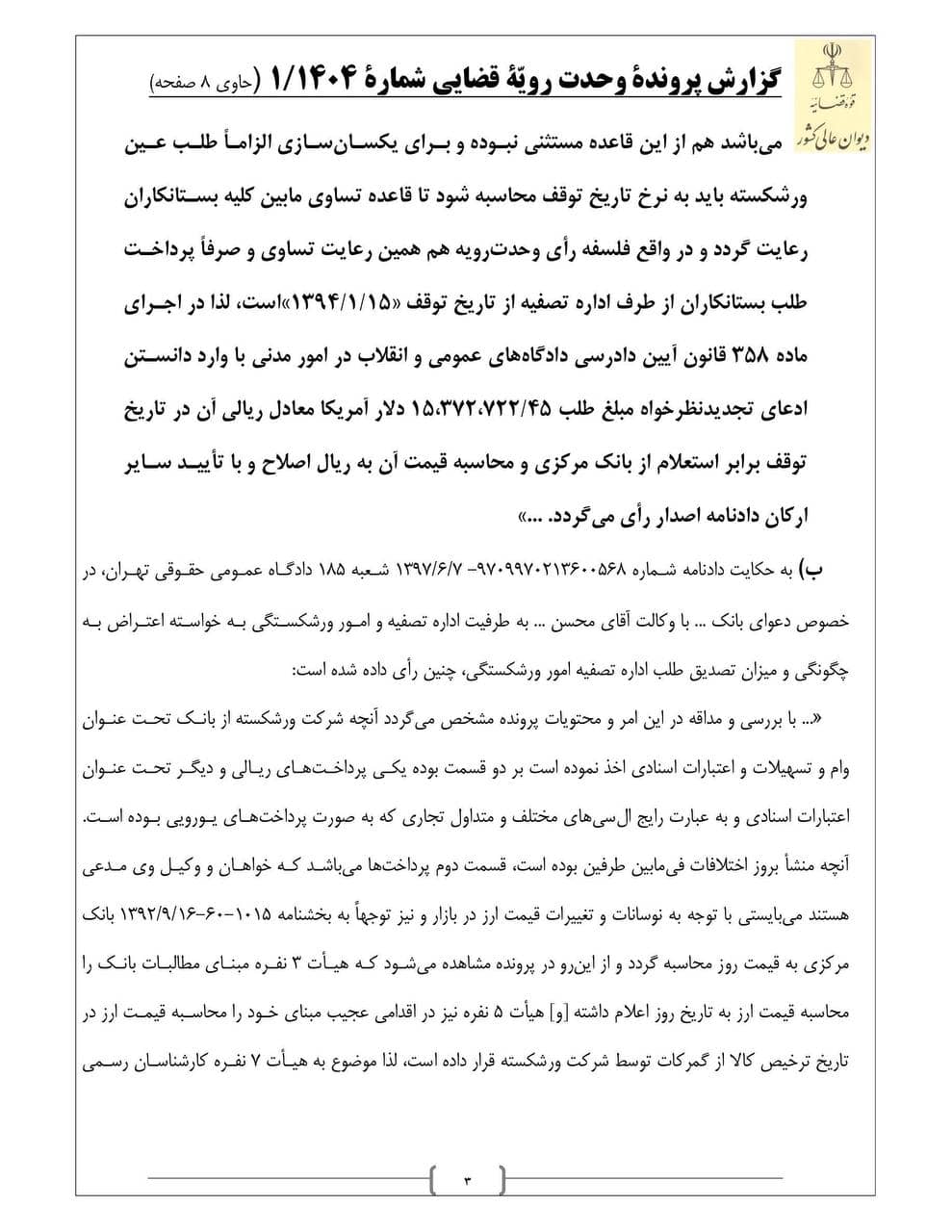 ….. نظر به اینکه برابر دادخواست تجدید نظرخواه و مستندات و جهات تجدید نظرخواهی و اینکه اعتراض آنها صرفاً نسبت به مبلغ دلار آمریکا بوده که این مبلغ باید معادل ریال آن در تاریخ توقف محاسبه شود نه اصل دلار به نرخ امروز با توجه به اصل یکسان سازی طلب بستانکاران نرخ دلار به تاریخ توقف محاسبه میشود و معادل ریال آن در مرحله تصفیه در طبقه بندی ذکر میشود و اینکه مفاد رأی وحدت رویه ۱۵۵-۱۳۴۷/۱۲/۱۳ دیوان عالی کشور که به عدم پرداخت خسارت تأخیر ایام بعد از تاریخ توقف به طلبکاران وثیقه دار تاجر ورشکسته دلالت دارد و هر طلبکاری که دارای طلب عین از ورشکسته میباشد هم از این قاعده مستثنی نبوده و برای یکسان سازی الزاماً طلب عین ورشکسته باید به نرخ تاریخ توقف محاسبه شود تا قاعده تساوی مابین کلیه بستانکاران رعایت گردد و در واقع فلسفه رأی وحدت رویه هم همین رعایت تساوی و صرفاً پرداخت طلب بستانکاران از طرف اداره تصفیه از تاریخ توقف «۱۳۹۴/۱/۱۵» است لذا در اجرای ماده ۳۵۸ قانون آیین دادرسی دادگاههای عمومی و انقلاب در امور مدنی با وارد دانستن ادعای تجدید نظرخواه مبلغ طلب ۳۷۲،۷۲۲/۴۵، ۱۵ دلار آمریکا معادل ریالی آن در تاریخ توقف برابر استعلام از بانک مرکزی و محاسبه قیمت آن به ریال اصلاح و با تأیید سایر ارکان دادنامه اصدار رأی می گردد. …