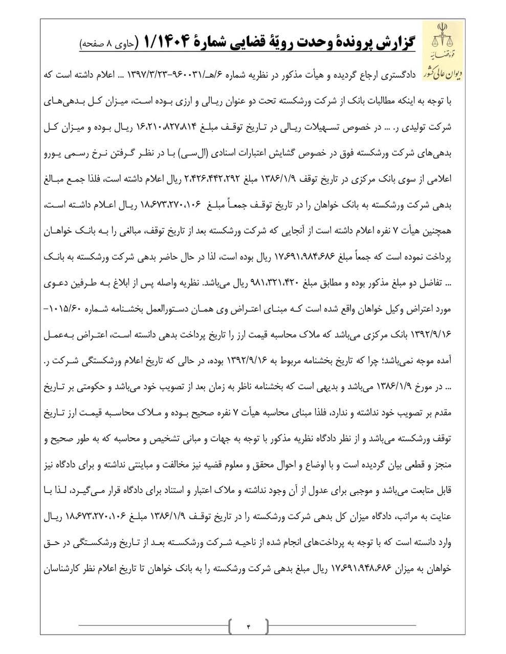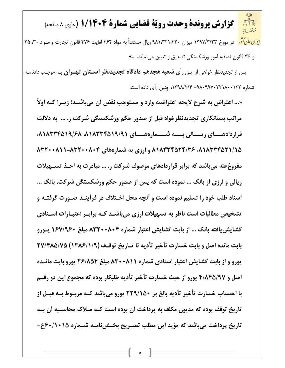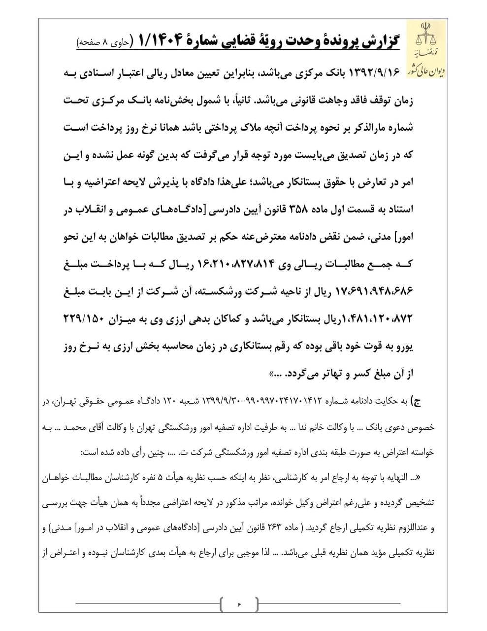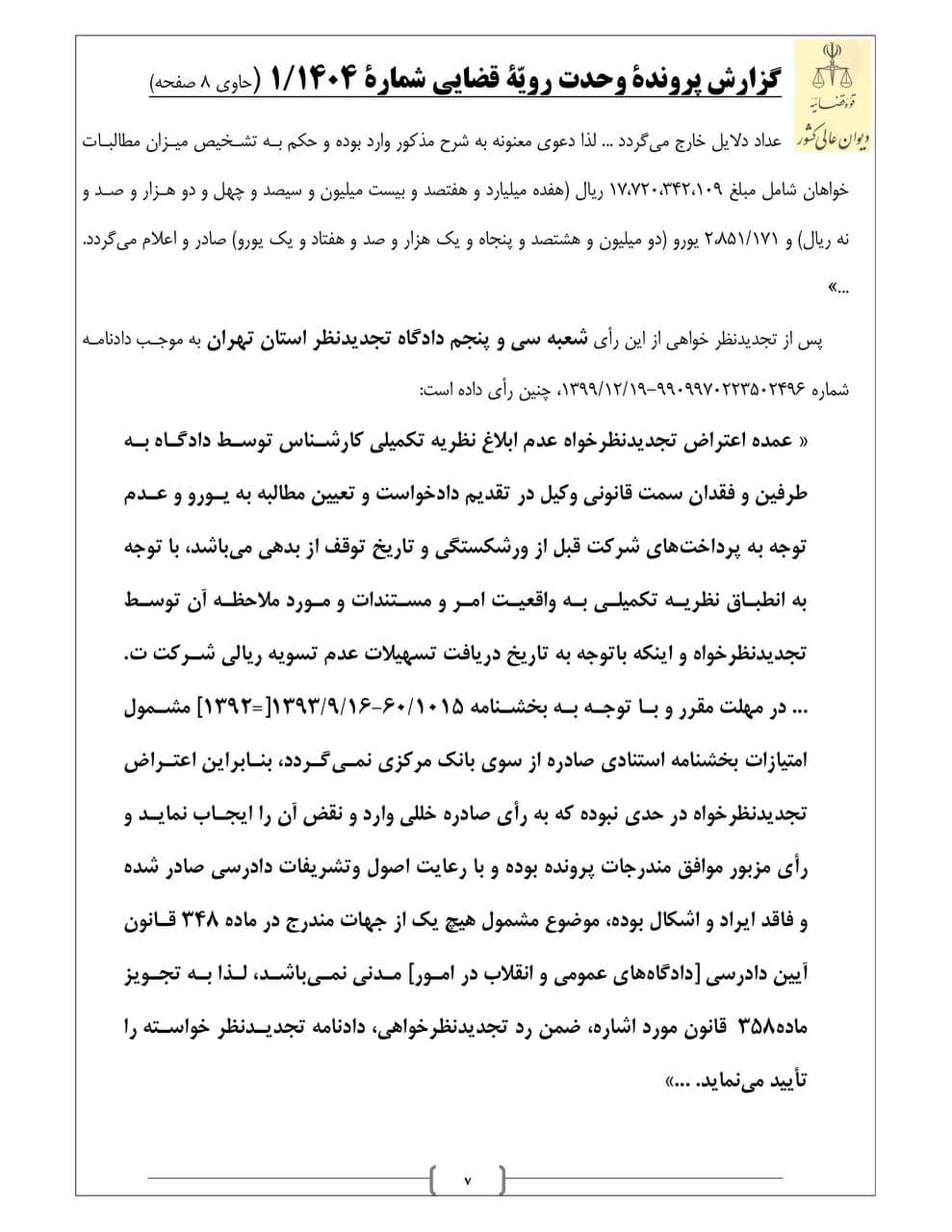 …. النهایه با توجه به ارجاع امر به کارشناسی نظر به اینکه حسب نظریه هیأت ۵ نفره کارشناسان مطالبات خواهان تشخیص گردیده و علی رغم اعتراض وکیل خوانده مراتب مذکور در لایحه اعتراضی مجدداً به همان هیات جهت بررسی و عند اللزوم نظریه تکمیلی ارجاع گردید ) ماده ۲۶۳ قانون آیین دادرسی دادگاههای عمومی و انقلاب در امور مدنی و نظریه تکمیلی مؤید همان نظریه قبلی میباشد.. .. لذا موجبی برای ارجاع به هیات بعدی کارشناسان نبوده و اعتراض از عداد دلایل خارج میگردد … لذا دعوی معنونه به شرح مذکور وارد بوده و حکم به تشخیص میزان مطالبات خواهان شامل مبلغ ۱۷۰۷۲۰۳۴۲،۱۰۹ ریال هفده میلیارد و هفتصد و بیست میلیون و سیصد و چهل و دو هزار و صد و نه ریال و ۲۸۵۱/۱۷۱ یورو دو میلیون و هشتصد و پنجاه و یک هزار و صد و هفتاد و یک یورو صادر و اعلام می گردد.