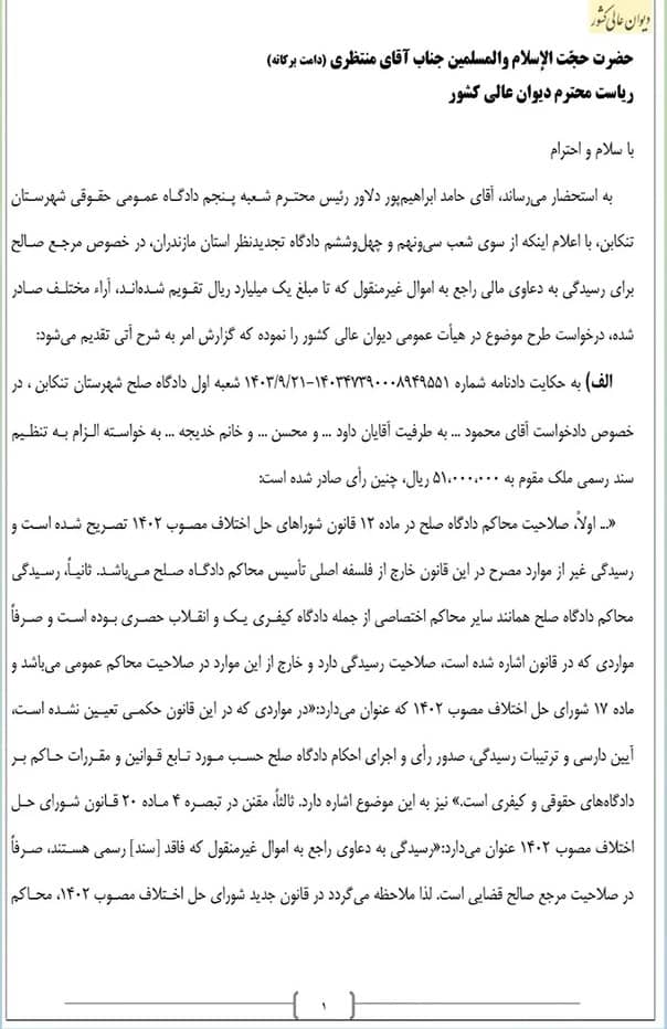 ب) به حکایت دادنامه شماره ۱۴۰۳۴۷۳۹۰۰۰۸۹۱۴۵۰۸ – ۱۴۰۳/۹/۲۱ شعبه دوم دادگاه صلح شهرستان تنکابن، در خصوص دعوای خواهان ها به خواسته خانم عذرا … دادخواستی به طرفیت آقای عبد الصالح … با موضوع اثبات وقوع بیع یک قطعه زمین مقوم به ۵۱۰،۰۰۰،۰۰۰ ریال، چنین رأی صادر شده است: