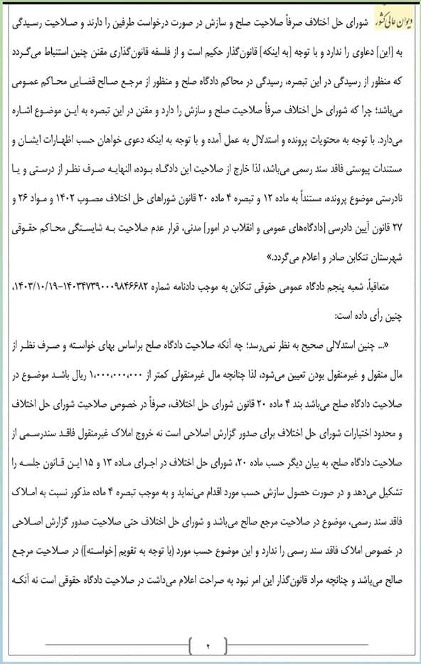 «… اولاً، صلاحیت محاکم دادگاه صلح در ماده ۱۲ قانون شوراهای حل اختلاف مصوب ۱۴۰۲ تصریح شده است و رسیدگی غیر از موارد مصرح در این قانون خارج از فلسفه اصلی تأسیس محاکم دادگاه صلح می باشد. ثانیاً، رسیدگی محاکم دادگاه صلح همانند سایر محاکم اختصاصی از جمله دادگاه کیفری یک و انقلاب حصری بوده است و صرفاً مواردی که در قانون اشاره شده است، صلاحیت رسیدگی دارد و خارج از این موارد در صلاحیت محاکم عمومی میباشد و ماده ۱۷ شورای حل اختلاف مصوب ۱۴۰۲ که عنوان می دارد: «در مواردی که در این قانون حکمی تعیین نشده است آیین دادرسی و ترتیبات رسیدگی صدور رأی و اجرای احکام دادگاه صلح حسب مورد تابع قوانین و مقررات حاکم بر دادگاه های حقوقی و کیفری است. نیز به این موضوع اشاره دارد. ثالثاً مقنن در تبصره ۴ ماده ۲۰ قانون شورای حل اختلاف مصوب ۱۴۰۲ عنوان می دارد رسیدگی به دعاوی راجع به اموال غیر منقول که فاقد سند (رسمی) هستند، صرفاً در صلاحیت مرجع صالح قضایی است. لذا ملاحظه می گردد در قانون جدید شورای حل اختلاف مصوب ۱۴۰۲ محاکم شورای حل اختلاف صرفاً صلاحیت صلح و سازش در صورت درخواست طرفین را دارند و صلاحیت رسیدگی به (این) دعاوی را ندارد و با توجه (اینکه) قانونگذار حکیم است و از فلسفه قانون گذاری مقنن چنین استنباط می گردد که منظور از رسیدگی در این تبصره رسیدگی در محاکم دادگاه صلح و منظور از مرجع صالح قضایی محاکم عمومی میباشد؛ چرا که شورای حل اختلاف صرفاً صلاحیت صلح و سازش را دارد و مقنن در این تبصره به این موضوع اشاره می دارد. با توجه به محتویات پرونده و استدلال به عمل آمده و با توجه به اینکه دعوی خواهان حسب اظهارات ایشان نزد مقام قضایی فاقد سند رسمی میباشد لذا خارج از صلاحیت این دادگاه میباشد لذا صرف نظر از درستی و یا نادرستی موضوع پرونده مستنداً به ماده ۱۲ و تبصره ۴ ماده ۲۰ قانون شوراهای حل اختلاف مصوب ۱۴۰۲ و ماده ۲۶ و ۲۷ قانون آیین دادرسی دادگاه های عمومی و انقلاب در امور مدنی قرار عدم صلاحیت به شایستگی محاکم حقوقی شهرستان تنکابن صادر و اعلام می گردد. …»