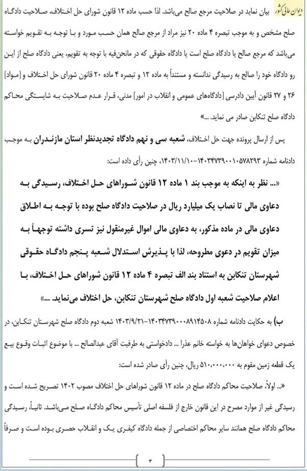 «… این دادگاه با توجه به محتویات پرونده و با پذیرش استدلال شعبه دوم دادگاه صلح تنکابن، مستنداً به بند الف تبصره ۴ ماده ۱۲ قانون شوراهای حل اختلاف مصوب ۱۴۰۲ به صلاحیت شعبه پنجم دادگاه عمومی حقوقی تنکابن حل اختلاف می نماید. … »