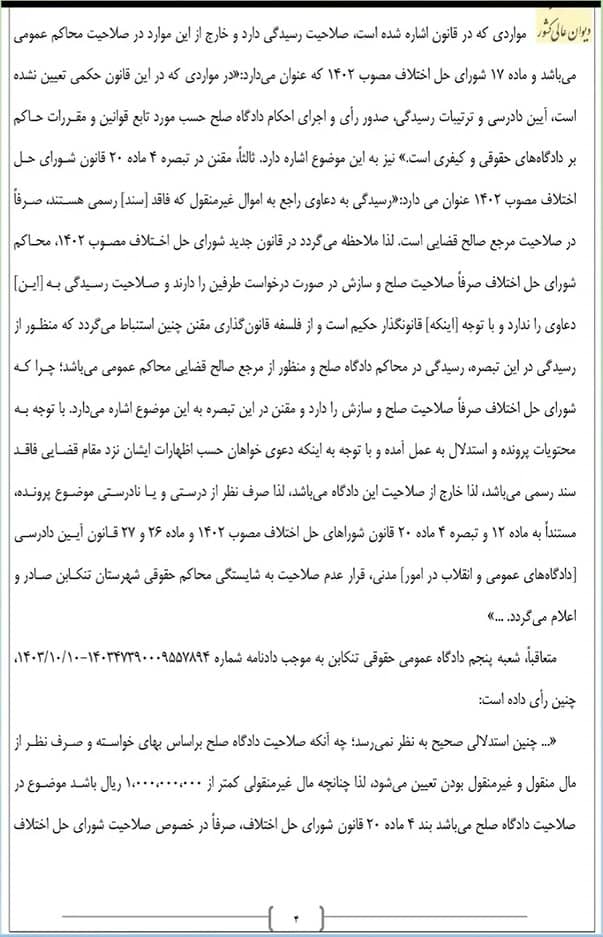 «… اولا، صلاحیت محاکم دادگاه صلح در ماده ۱۲ قانون شوراهای حل اختلاف مصوب ۱۴۰۲ تصریح شده است و رسیدگی غیر از موارد مصرح در این قانون خارج از فلسفه اصلی تأسیس محاکم دادگاه صلح میباشد. ثانیاً، رسیدگی محاکم دادگاه صلح همانند سایر محاکم اختصاصی از جمله دادگاه کیفری یک و انقلاب حصری بوده است و صرفاً مواردی که در قانون اشاره شده است صلاحیت رسیدگی دارد و خارج از این موارد در صلاحیت محاکم عمومی میباشد و ماده ۱۷ شورای حل اختلاف مصوب ۱۴۰۲ که عنوان می دارد: «در مواردی که در این قانون حکمی تعیین نشده است آیین دارسی و ترتیبات رسیدگی صدور رأی و اجرای احکام دادگاه صلح حسب مورد تابع قوانین و مقررات حاکم بر دادگاه های حقوقی و کیفری است. نیز به این موضوع اشاره دارد. ثالثاً مقنن در تبصره ۴ ماده ۲۰ قانون شورای حل اختلاف مصوب ۱۴۰۲ عنوان می دارد رسیدگی به دعاوی راجع به اموال غیر منقول که فاقد سند رسمی هستند، صرفاً در صلاحیت مرجع صالح قضایی است. لذا ملاحظه می گردد در قانون جدید شورای حل اختلاف مصوب ۱۴۰۲، محاکم شورای حل اختلاف صرفاً صلاحیت صلح و سازش در صورت درخواست طرفین را دارند و صلاحیت رسیدگی به (این) دعاوی را ندارد و با توجه (به اینکه) قانون گذار حکیم است و از فلسفه قانون گذاری مقنن چنین استنباط می گردد که منظور از رسیدگی در این تبصره رسیدگی در محاکم دادگاه صلح و منظور از مرجع صالح قضایی محاکم عمومی میباشد؛ چرا که شورای حل اختلاف صرفاً صلاحیت صلح و سازش را دارد و مقنن در این تبصره به این موضوع اشاره می دارد. با توجه به محتویات پرونده و استدلال به عمل آمده و با توجه به اینکه دعوی خواهان حسب اظهارات ایشان و مستندات پیوستی فاقد سند رسمی میباشد لذا خارج از صلاحیت این دادگاه بوده النهایه صرف نظر از درستی و یا نادرستی موضوع پرونده، مستنداً به ماده ۱۲ و تبصره ۴ ماده ۲۰ قانون شوراهای حل اختلاف مصوب ۱۴۰۲ و مواد ۲۶ و ۲۷ قانون آیین دادرسی دادگاه های عمومی و انقلاب در امور مدنی قرار عدم صلاحیت به شایستگی محاکم حقوقی شهرستان تنکابن صادر و اعلام می گردد.»